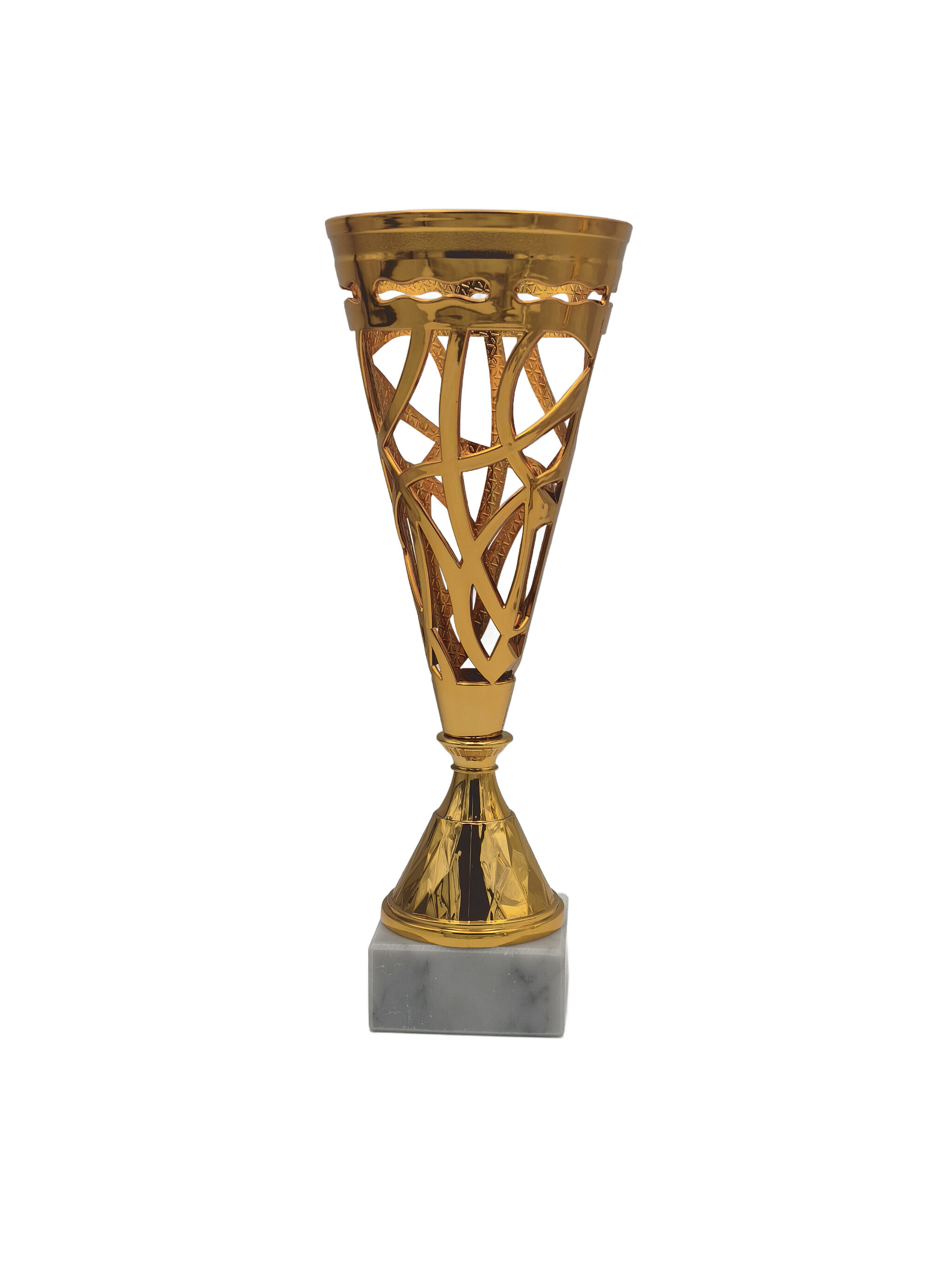 Pohár z řady Ker je mistrovským dílem moderního designu, který sází na vzdušnost a propracované detaily. Tento model definuje štíhlá, kónická silueta „V“, která je ozvláštněna unikátním prolamovaným kalichem. Struktura těla připomíná propletená vlákna nebo organickou síť, což trofeji dodává neuvěřitelnou lehkost a vizuální hloubku. Je to ideální volba pro ty, kteří hledají něco víc než jen klasický plný pohár.
