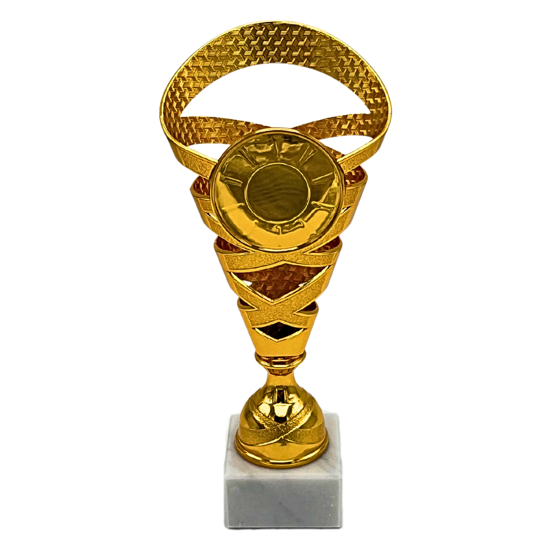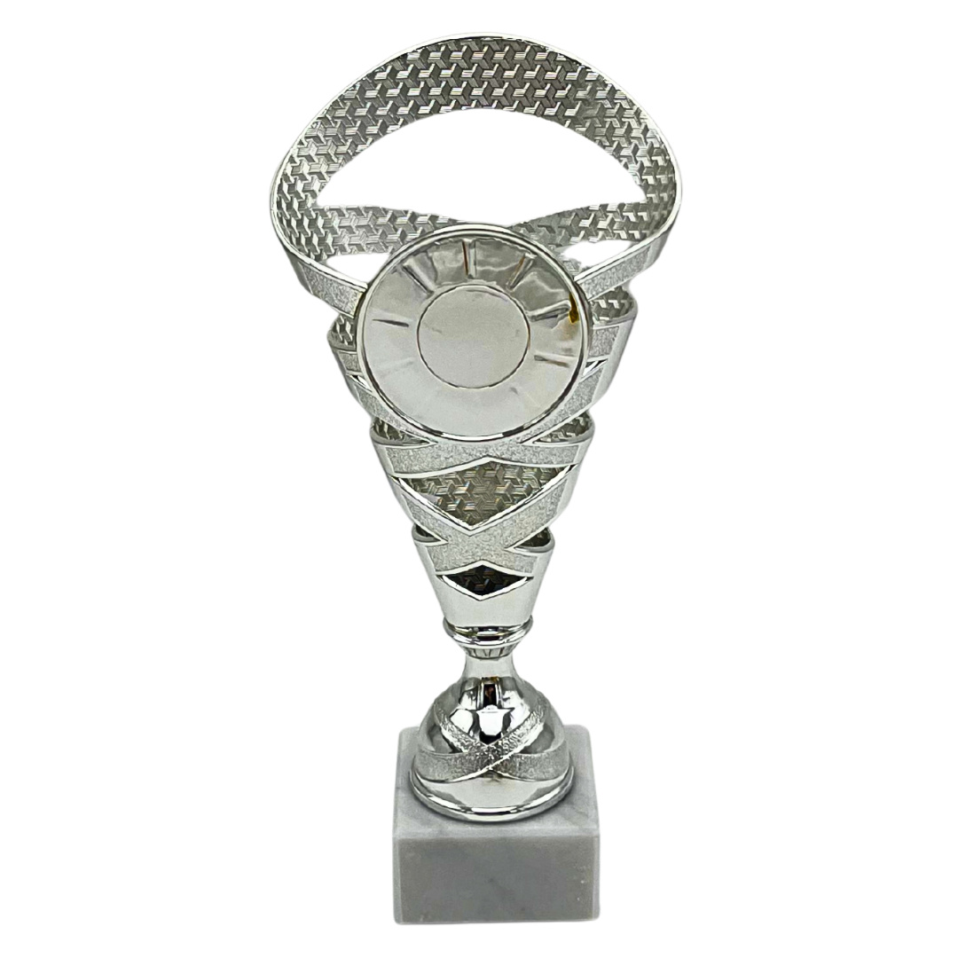 Pohár Nasta je ideální volbou pro ty, kteří hledají kombinaci moderního umění a klasické sportovní trofeje. Jeho unikátní kalich s jemnou texturou připomínající pletenou mřížku dodává poháru hloubku a dynamiku. Dominantním prvkem je středový kruhový prostor, který je připraven pro umístění vašeho vlastního emblému, loga klubu nebo symbolu konkrétního sportu.