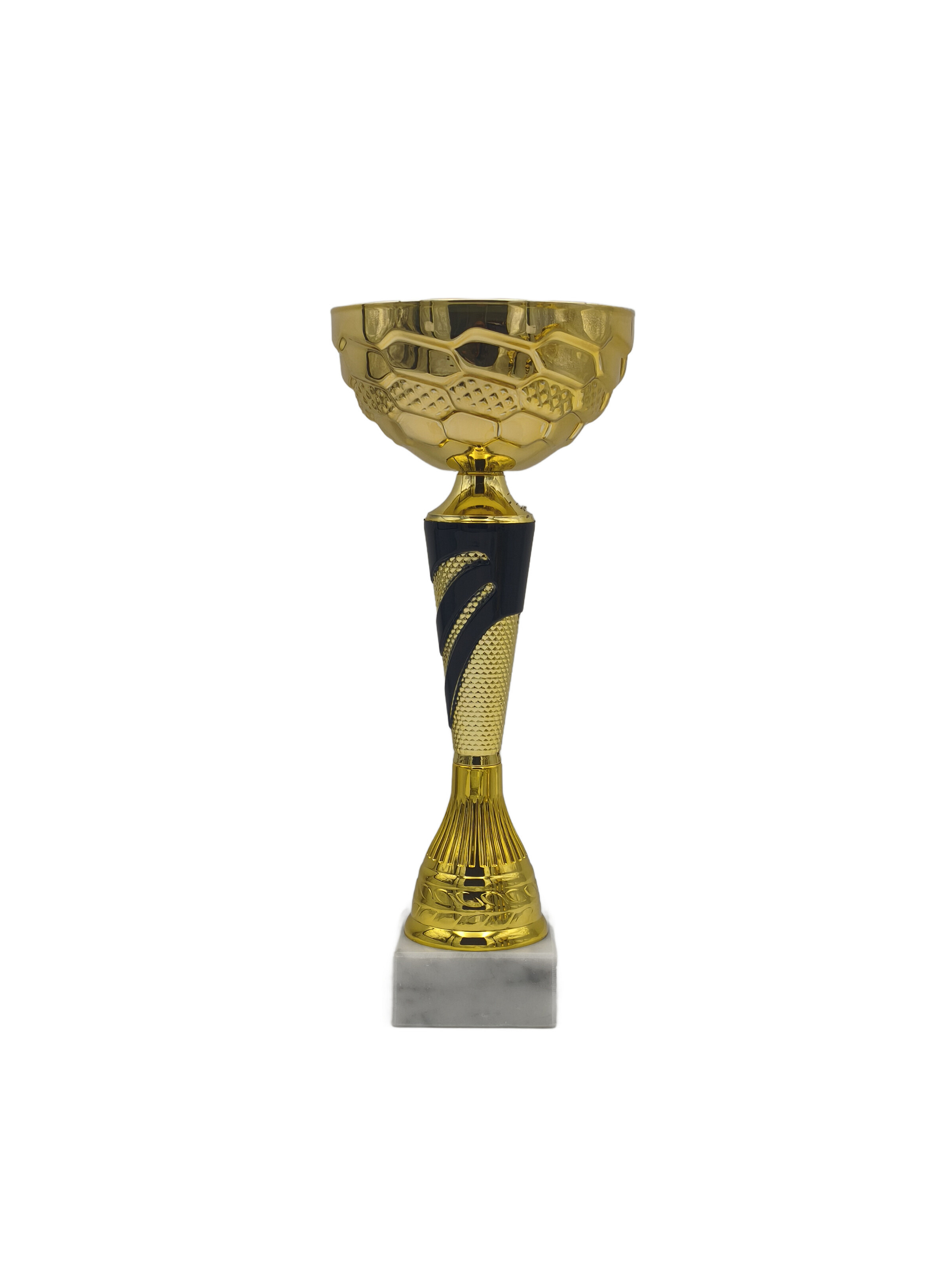 Hexagonální kalich: Horní část poháru zdobí výrazná včelí plástev (hexagonální textura), která vytváří zajímavou hru odlesků a dodává trofeji moderní, technický vzhled.
