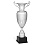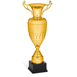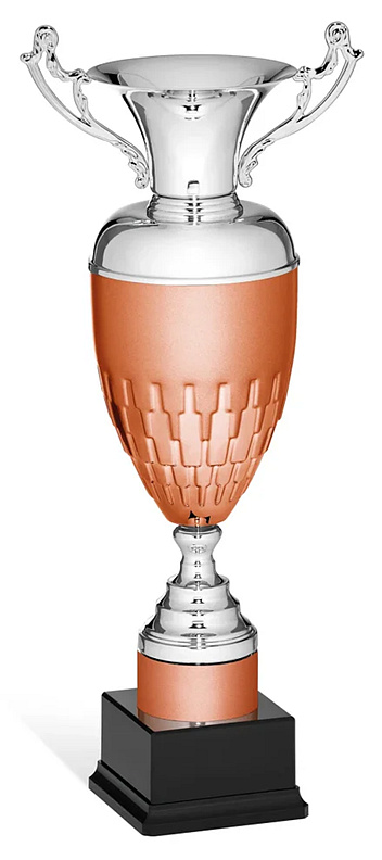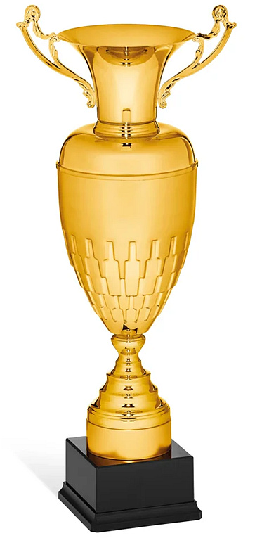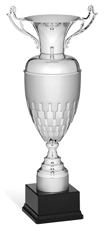 Pohár Mark je hrdým zástupcem exkluzivní řady trofejí, které na první pohled evokují majestátnost a odkaz velkých sportovních klání. Tento model se pyšní robustním a poctivým tvarem klasické amfory, který nikdy nevyjde z módy. Tělo kalichu je vizuálně rozděleno do dvou částí – zatímco horní límec zůstává dokonale hladký a lesklý, spodní polovina zaujme propracovaným plastickým reliéfem připomínajícím překrývající se štíty nebo geometrické šupiny. Celkový honosný dojem umocňuje dvojice klasických, bohatě ornamentálně zdobených uší. Kalich je usazen na tradičně tvarované, stupňovité noze, která pevně dosedá na masivní černý podstavec.