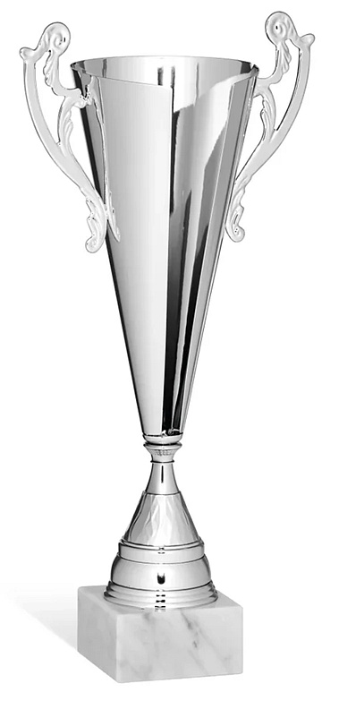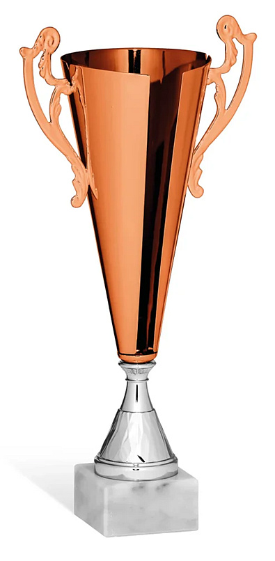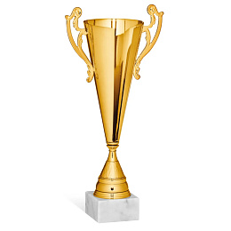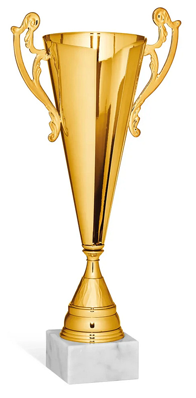 Pohár Artuch je ztělesněním čisté elegance a rafinovaného designu, který na první pohled upoutá svou štíhlou a vysokou siluetou. Tento model mistrně kombinuje zdánlivě protikladné prvky: hladký, vysoce leštěný kalich ve tvaru štíhlého kužele je narušen moderním, minimalistickým vertikálním průřezem, který trofeji dodává neotřelý vzhled. Tento moderní základ je ovšem zasažen do kontrastu s dvojicí honosných, tradičně tvarovaných uší s bohatým ornamentálním zdobením. Celá kompozice plynule přechází do elegantní profilované nohy a je pevně usazena na bloku ze světlého mramoru.