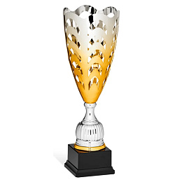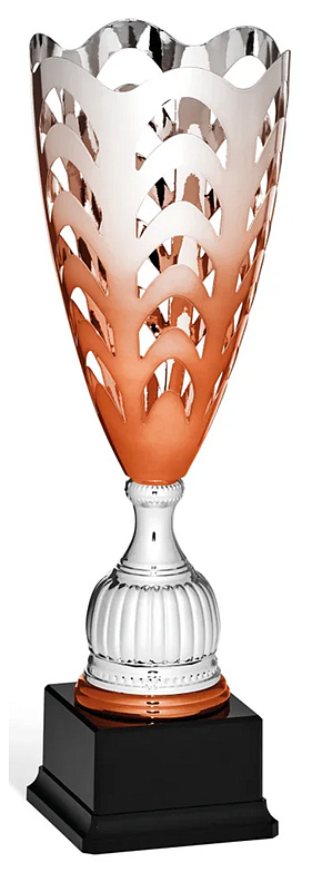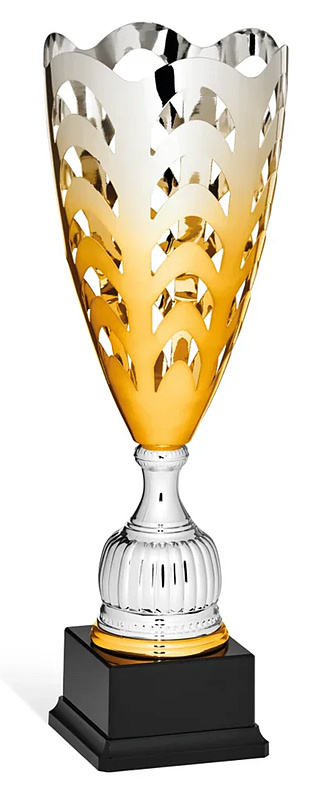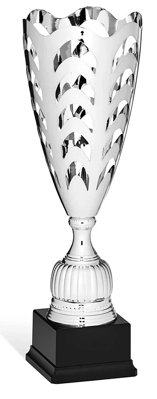 Pohár Modano je ideální volbou pro ty, kteří hledají trofej, jež svým moderním a elegantním vzhledem zazáří na každém vyhlášení. Tento model sází na inovativní dvoustěnnou siluetu kalichu, která vkusně kombinuje kontrastní vrstvy. Dominantou je vnější zářivě stříbrný plášť s výrazným prořezávaným vzorem vrstvených oblouků (připomínajících plameny či lístky), kterým efektně prosvítá hladká vnitřní barevná plocha. Vlnitý okraj kalichu a jeho štíhlý profil plynule přecházejí do propracované stříbrné nohy s jemným svislým žebrováním a elegantními detaily.