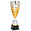 Masivní černý podstavec: Robustní tmavá základna ve tvaru krychle dodává trofeji potřebnou stabilitu a nechává dokonale vyniknout zářivým kovovým prvkům.