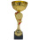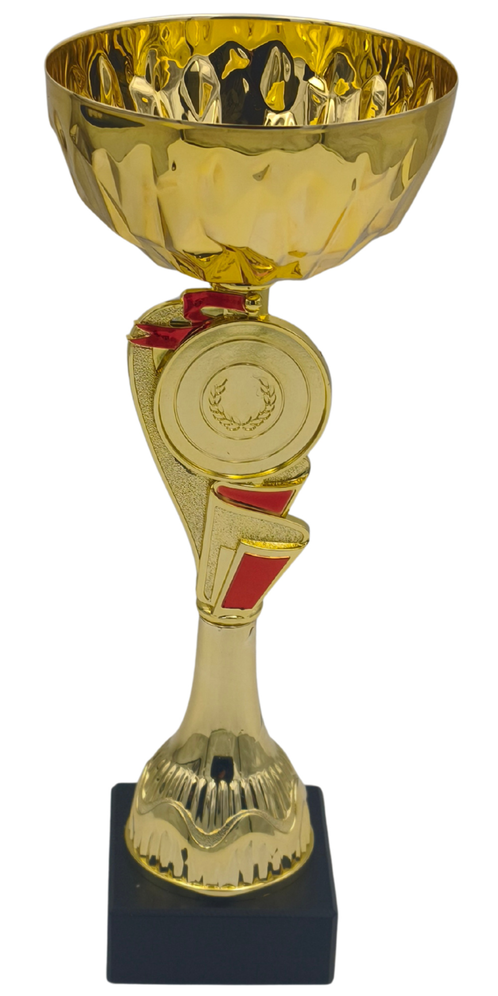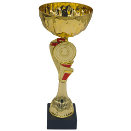 Pohár Flagos je ideální volbou pro ty, kteří hledají trofej s moderním designem a jasným vítězným nábojem. Jeho název je odvozen od unikátního těla, které zdobí vystupující červené detaily připomínající vlající vlajky nebo stuhy vítězů. Dominantou horní části je široký zlatý kalich s výrazným geometrickým reliéfem, který hází zajímavé odlesky. Středobodem trofeje je kruhový prostor s jemným motivem vavřínového věnce, který je připraven pro umístění vašeho vlastního emblému nebo loga.